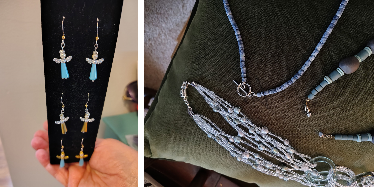 “While I was putting the wings on an angel, I thought my angels just might help raise money for the angel fund,” ViAnn says. “As luck would have it, I had appointments and errands to run. When I left, I took my bag of completed angels with me. The next thing I knew, I was standing outside on the sidewalk of a strip mall, telling people why they need to buy my angel earrings.”